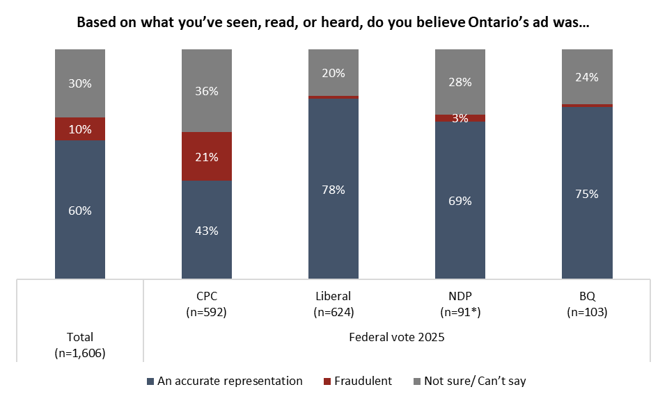 The idea put forth by Trump that the ad was “fraudulent” and “fake” doesn’t pass muster in this country. Canadians are six-times as likely to say that it was an accurate representation of Reagan’s views (60%) than those who agree with the president (10%). The veracity of the ad has also been confirmed by third parties, though that doesn’t seem to have swayed Trump.