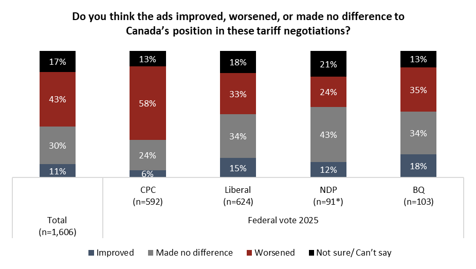 Canadians are evidently of two minds over the whole saga. While the majority agree with running the ad, many concede that it likely put Canada in a worse negotiating position. Two-in-five (43%) say this, while 11 per cent say Canada’s position improved and three-in-10 say it didn’t change.