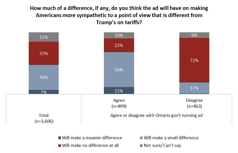 If the goal of the ad was to change public opinion south of the border, many Canadians feel this has been partially accomplished. Approaching half (47%) say that it will have an impact in terms of bringing Americans closer to the Canadian view of these tariffs and away from Trump’s. That said, few feel this will be a major impact (7%) versus a smaller one (40%). More than one-in-three (37%) say it likely will have no impact.