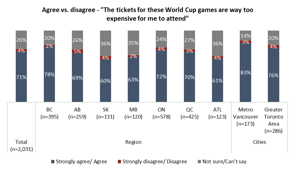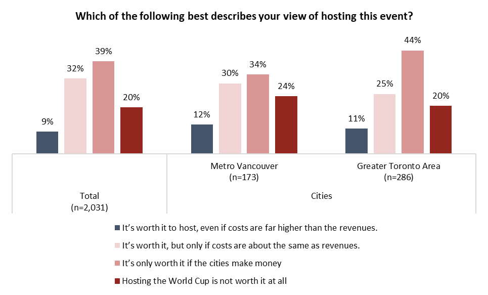 New data from the non-profit Angus Reid Institute finds most Canadians (71%) believe hosting the World Cup is it only worth it to the cities if revenues meet (32%) or exceed (39%) costs.