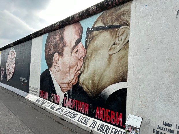 The fall of the Berlin Wall in 1989 was supposed to represent the victory of U.S. values over socialism and communism. The wall mural, called “the socialist kiss,” represents the Soviet Union’s Leonid Brezhnev and East Germany’s Erich Honecker. Image: Mel Rothenburger.)
