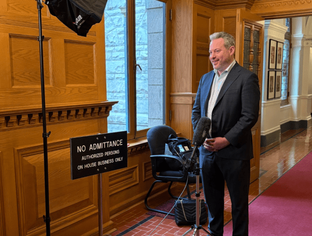 Interim BC Conservative leader Trevor Halford in Legislature hallway talking about moving forward. (Image: Trevor Halford, Facebook)