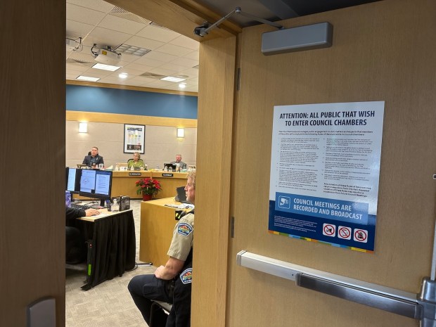 A list of no fewer than 15 conditions has been posted on the door. “ATTENTION: ALL PUBLIC THAT WISH TO ENTER COUNCIL CHAMBERS” it says in large block letters.