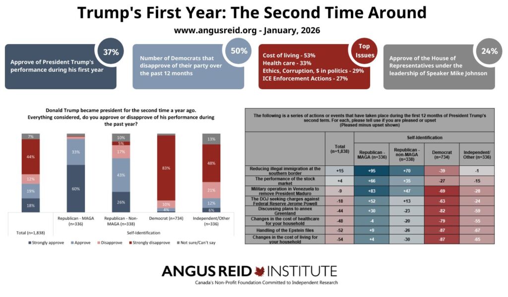 January 22, 2026 – The impacts of U.S. President Donald Trump’s first year of his current term appear to be creating serious fissures between MAGA and non-MAGA Republican voters.
