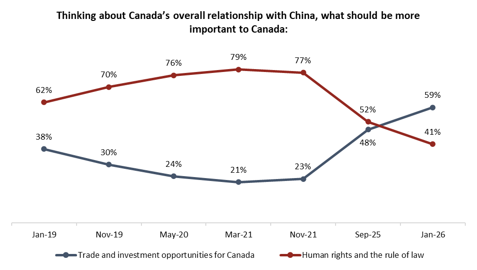 Concerns over China’s history of human rights violations has long coloured Canada’s approach to the country. It took on a renewed focus in during and after the 1,019-day long detention of two Canadians, Michael Kovrig and Michael Spavor. From 2019 to 2022, the vast majority of Canadians said if they had to make a choice between two priorities, they would rather Canada focus on China’s record on human rights and the rule of law rather than pursuing trade and investment opportunities. In 2025, that proportion was divided near evenly, as threats of tariffs from Donald Trump rattled Canadians. Now, after Carney’s trip to China, the first from a PM since 2017, three-in-five (59%) prioritize the economic aspect of this equation.