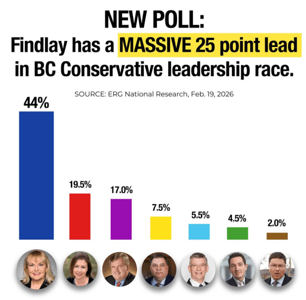 Kerry-Lynne Findlay, a former MP and federal cabinet minister in the Stephen Harper government, said today (Feb. 23, 2026) a new poll shows her with a commanding lead.