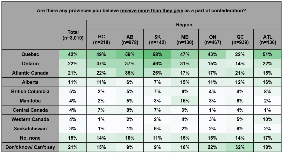 Indeed, 29 per cent of Canadians say Alberta gives more than it gets, well ahead of any other province or region, with Saskatchewan second at 13 per cent. On the other side of the equation, Canadians are most likely to say that Quebec benefits more than others (42%), well ahead of second place Ontario (22%).