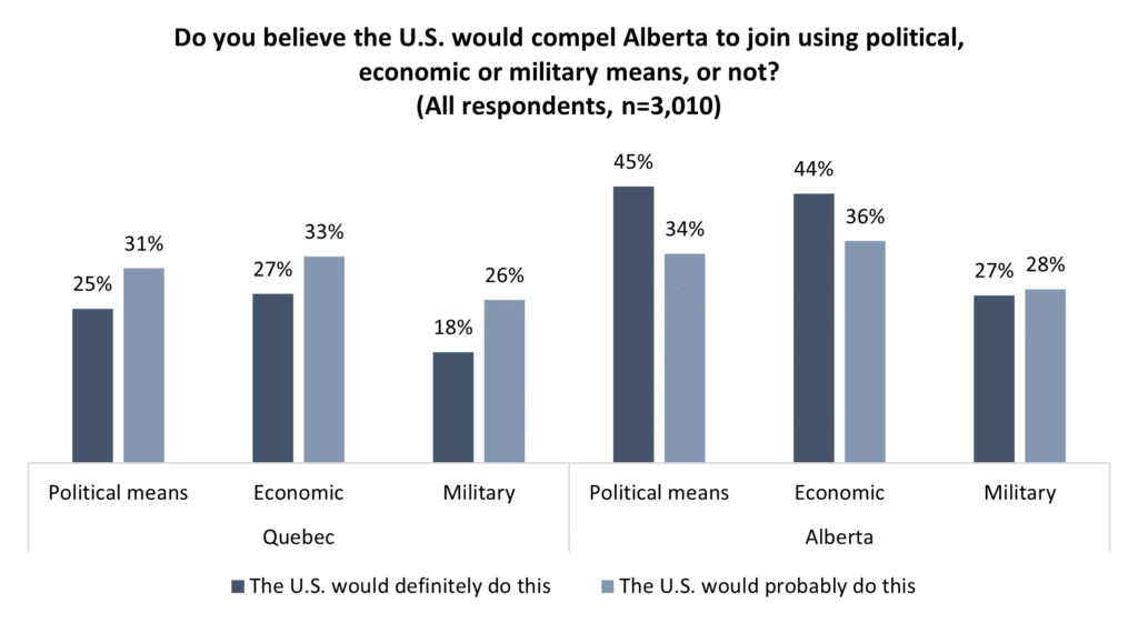 Nearly half say they U.S. would “definitely” try to economically and politically pressure Alberta to join as a new state. Another one-third say this would “probably” happen. Canadians are less sure this would happen to Quebec, but half feel it is likely.