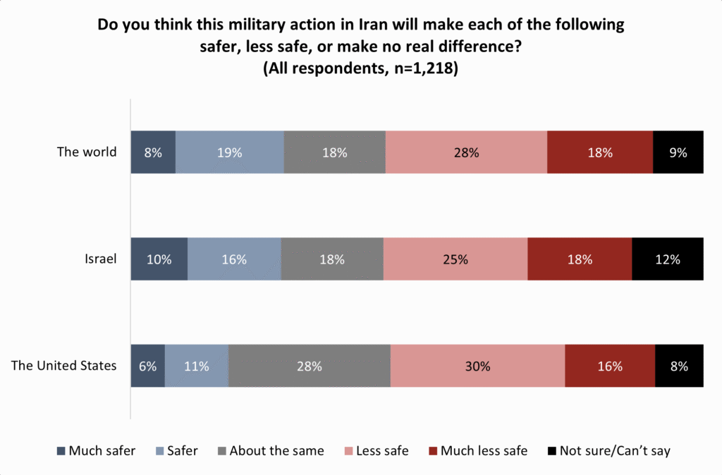 Potential destabilization also looms as a concern. Approaching half say that the world (47 per cent) and the United States itself (46 per cent) are now less safe due to these military actions. Around half as many feel the world will be safer (27 per cent), while fewer feel this way about the U.S. (17 per cent).
