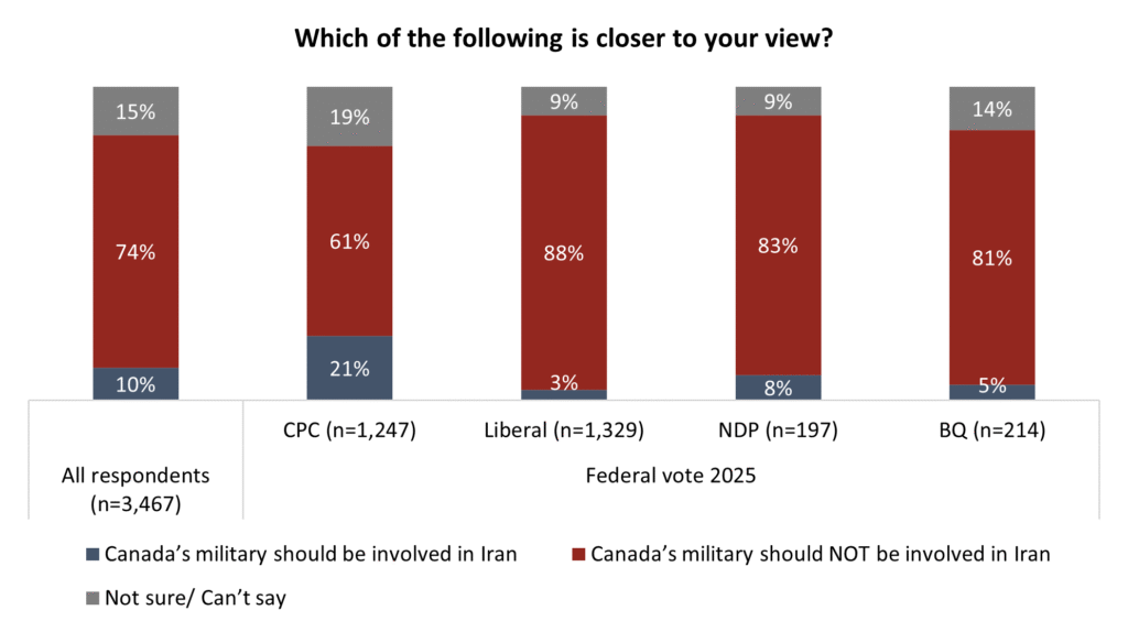 - While 10 per cent of Canadians support military involvement, this rises to 21 per cent among past CPC voters and drops to three and five per cent for Liberals and New Democrats, respectively.
