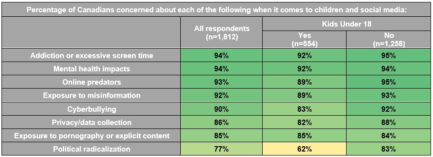 And there is near unanimous concern from Canadians over children’s potential exposure on social media to misinformation (92% concerned), cyberbullying (90%), explicit content (85%), negative mental health impacts (94%) and addiction (94%).