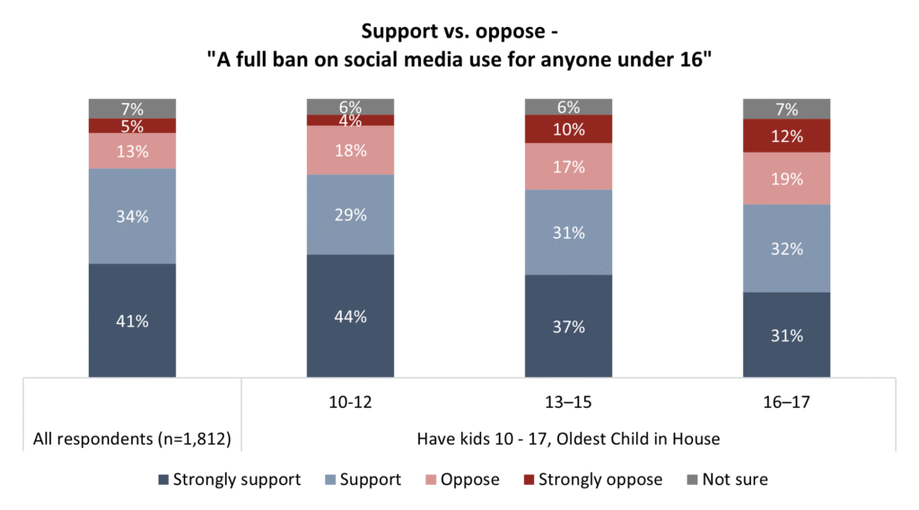 - When those who want under-16’s banned only from certain apps are asked which social media should be verboten, TikTok (88%), X/Twitter (86%), and Snapchat (84%) are at the top of the list. Only half (48%) would ban kids under 16 from YouTube.