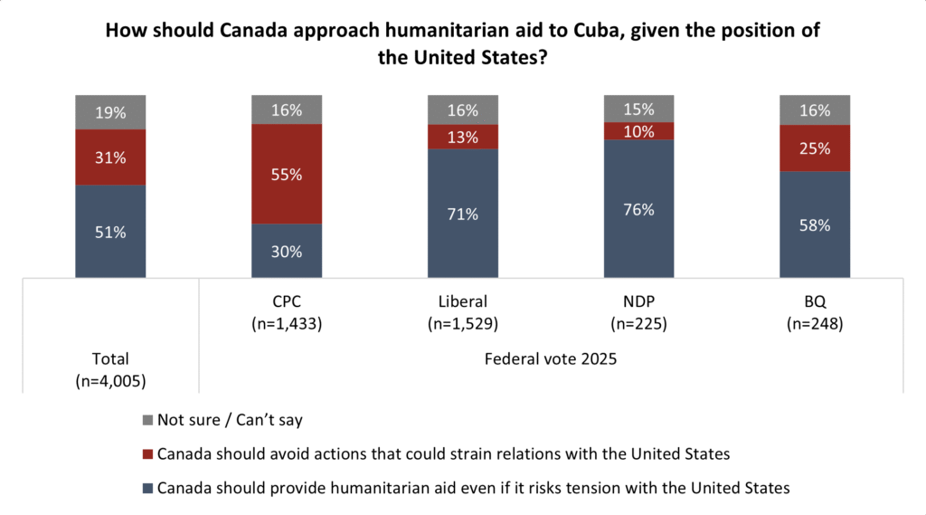 So far, Canada has supplied $8 million in humanitarian aid, mostly to help fortify Cuba’s food security. One-third (34%) say that is enough support from Canada; one-third (32%) want their country to do more to assist. There are also one-in-five (19%) who believe Canada should be doing less than that or should not have sent that aid at all.